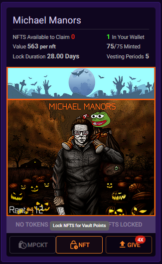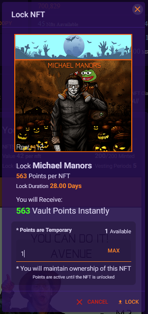 Here you can choose how many of the NFTs you want to Lock (you might have multiple duplicates) and it will tell you the amount of Vault Points you will receive for doing so, as well as how long the Lock Duration is.&#x20;